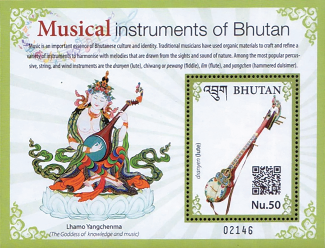 笔者收藏了一套不丹2017年发行的乐器邮票,含一枚小全张和一枚小型张。